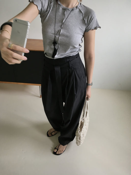 The black items, such as the wrinkled blouse with voluminous sleeves, the belt with animal print, and the pumps with big ribbons, show off a modern look. Add a touch of fresh lemon yellow to make the look even more striking.