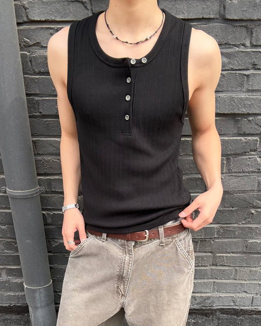 A cheerful outfit that combines lemon yellow pants, top, and sandals. The healthy tank top gives a relaxed feel without looking too much. The white bag adds a clean touch.