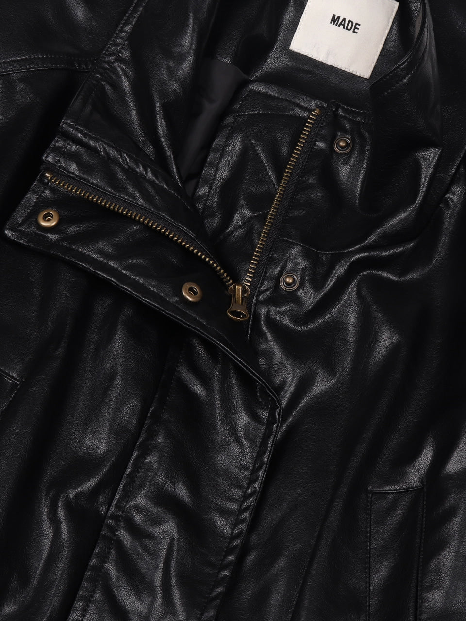 - ビンテージなミリタリーデザインをビーガンレザー素材で完成させたフェイクレザージャケットです