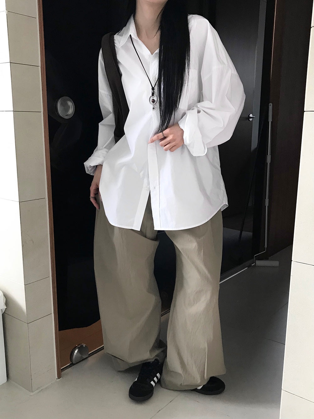 The wide silhouette and drape created by the fabric with a loose feel create a sophisticated impression.