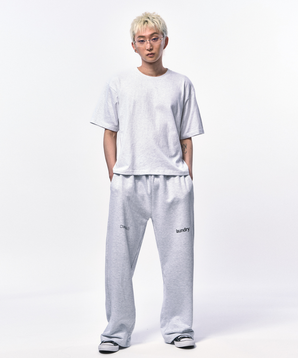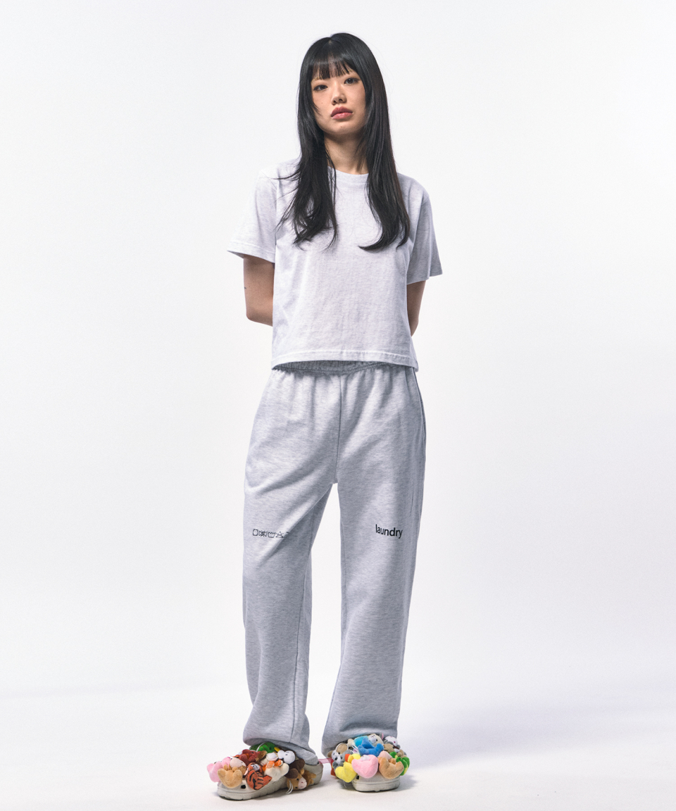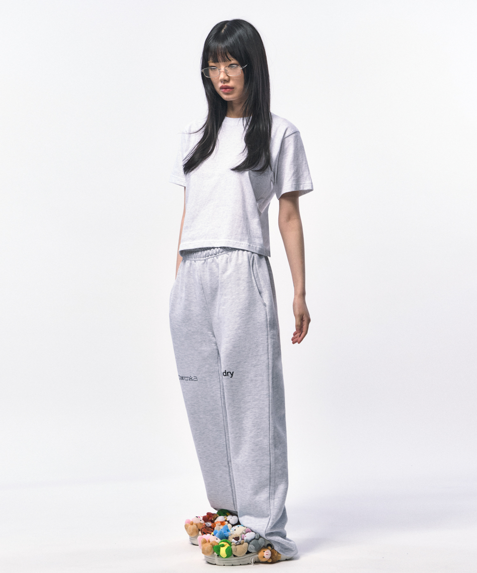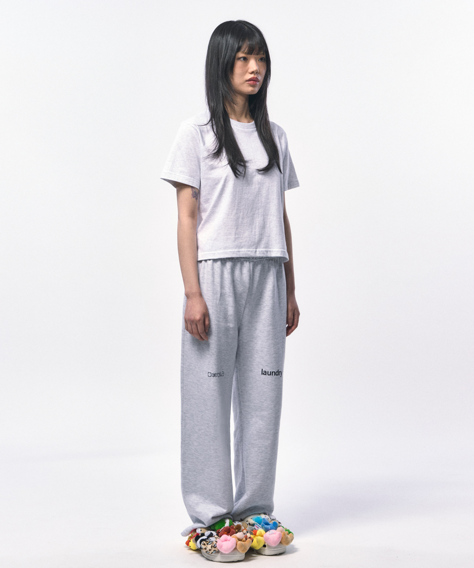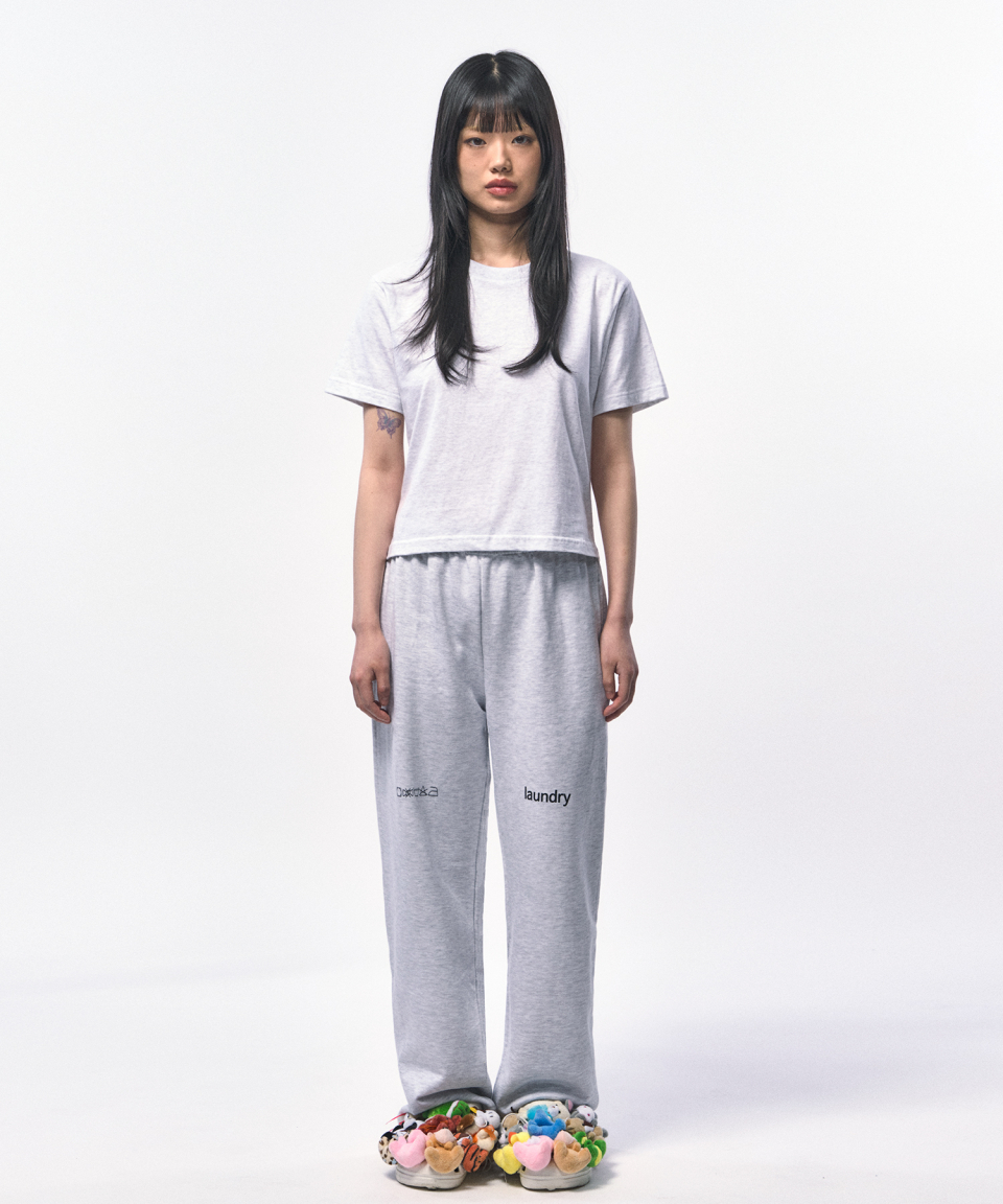 淡く柔らかなメランジホワイトが、クロップ丈のラインをよりクリーンに引き立てる一枚。