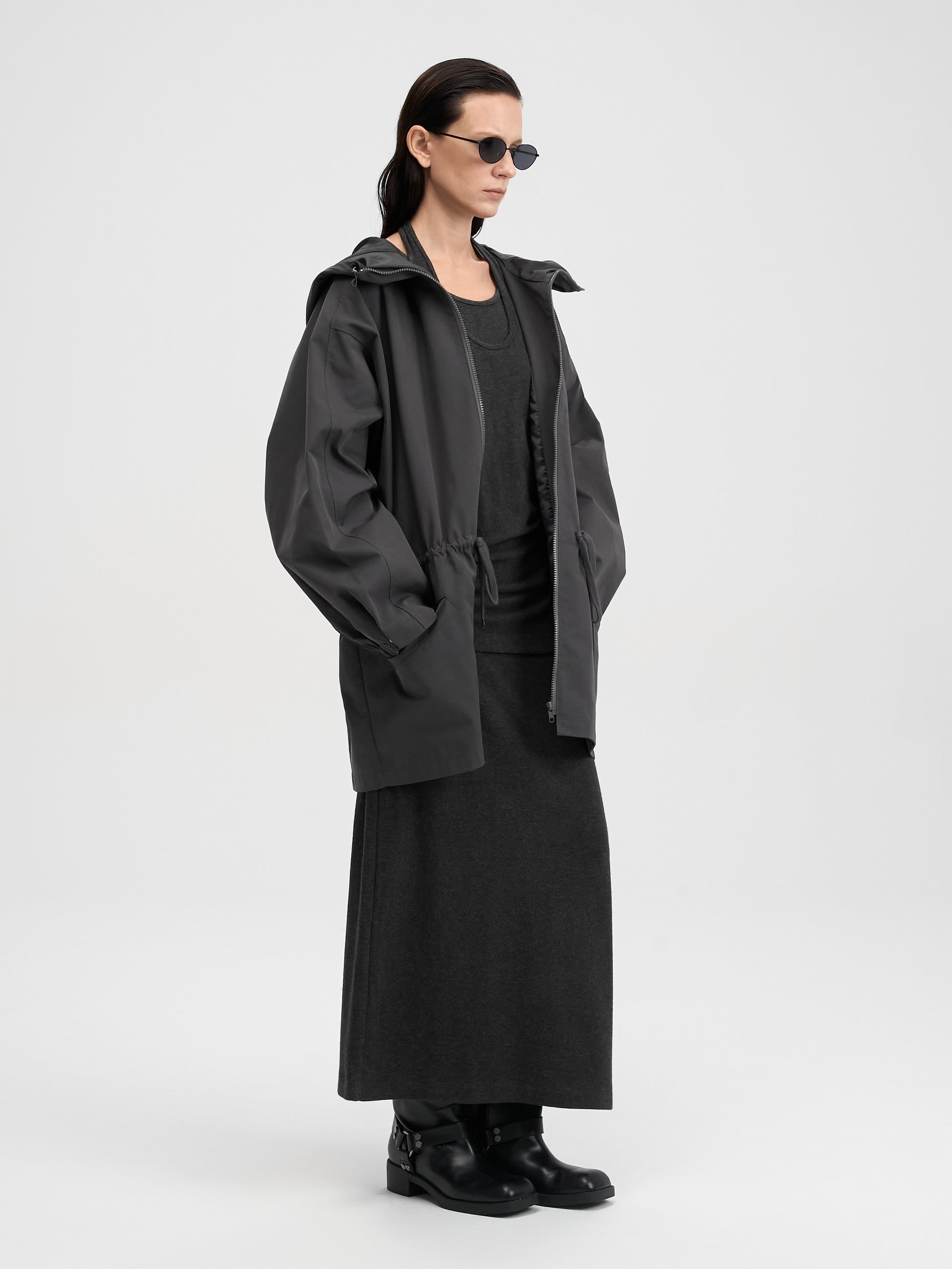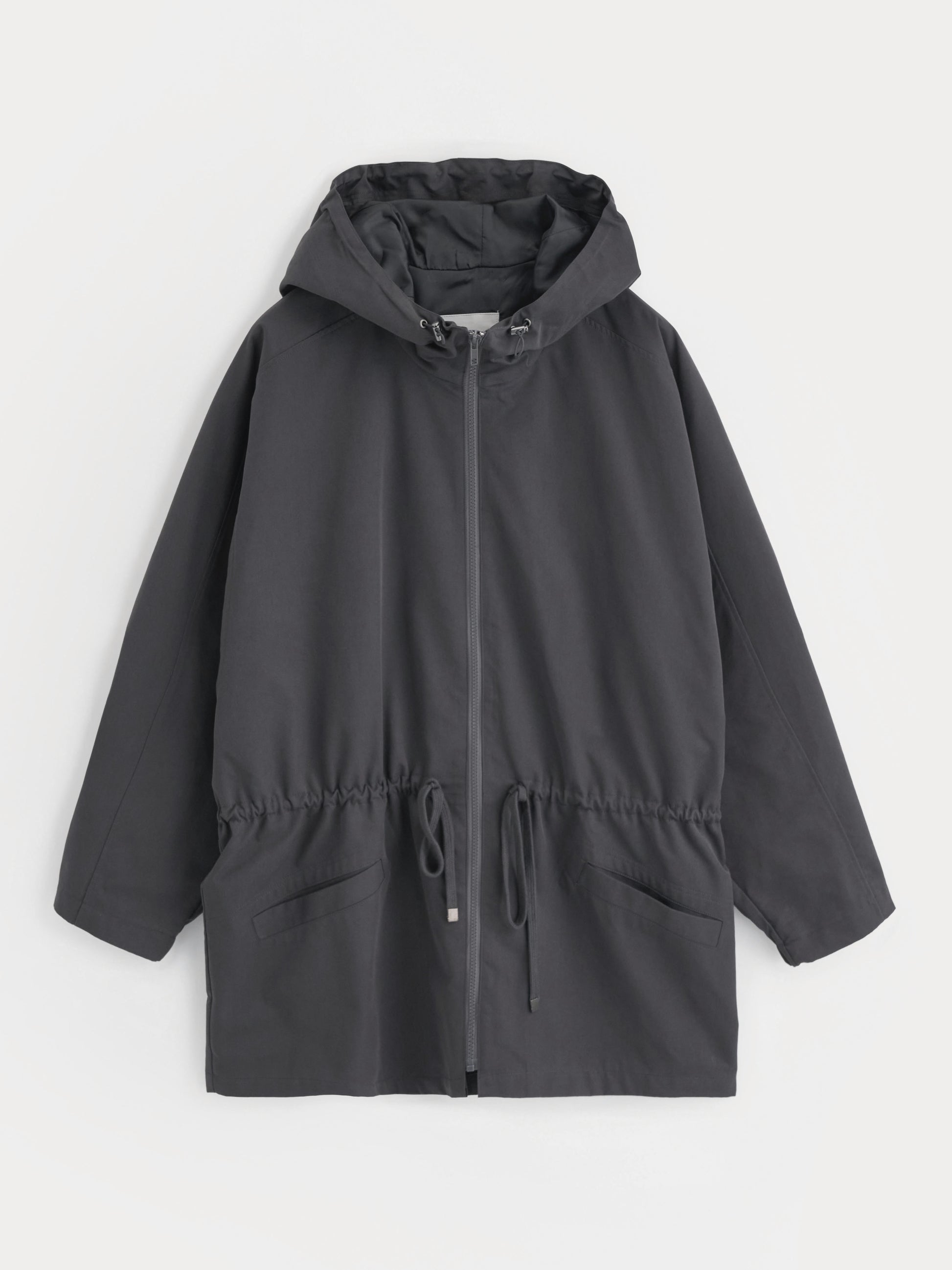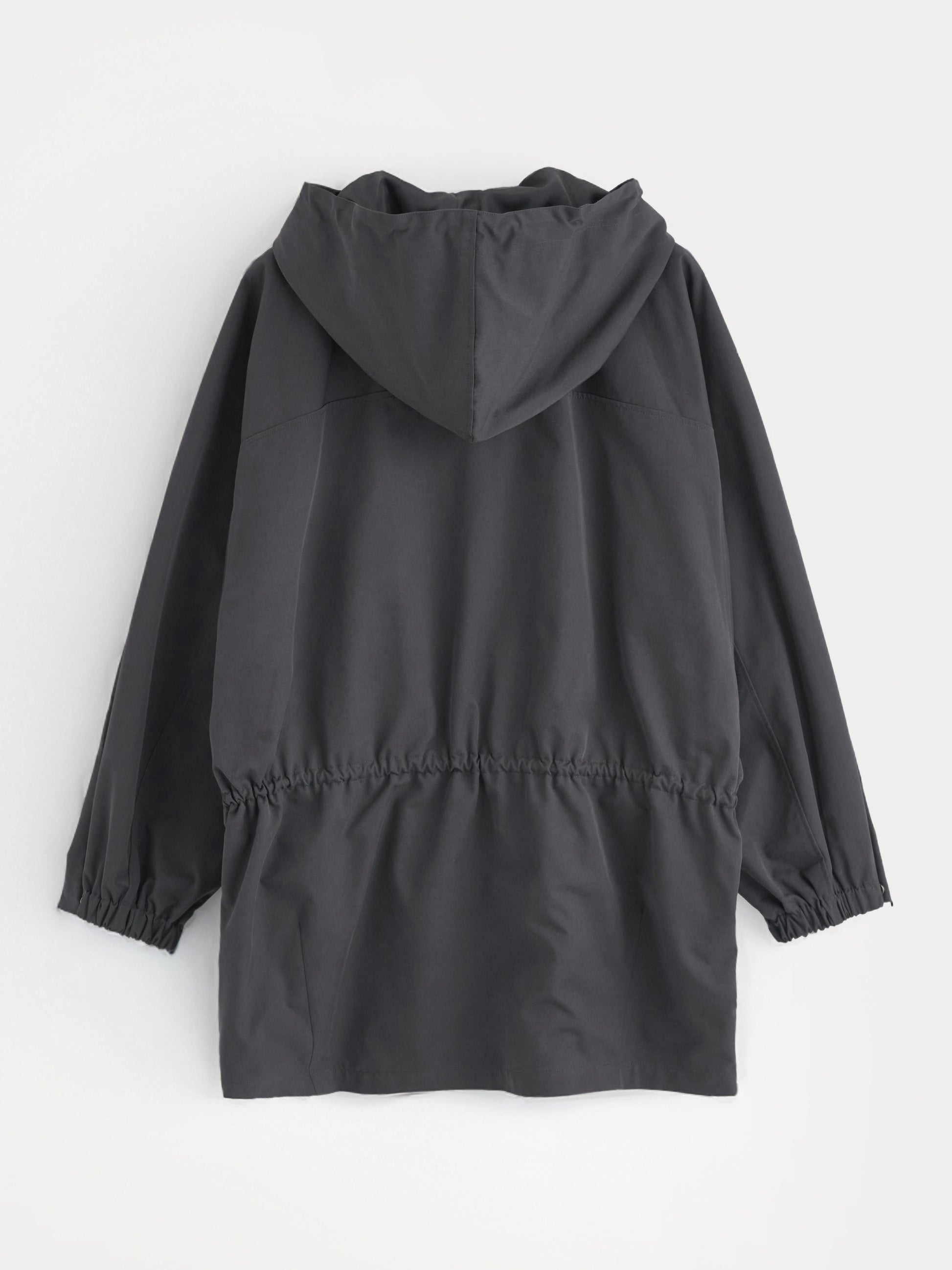 ウエスト部分のドローストリングでフィット感を調整でき、フード付きデザインで実用性も抜群。