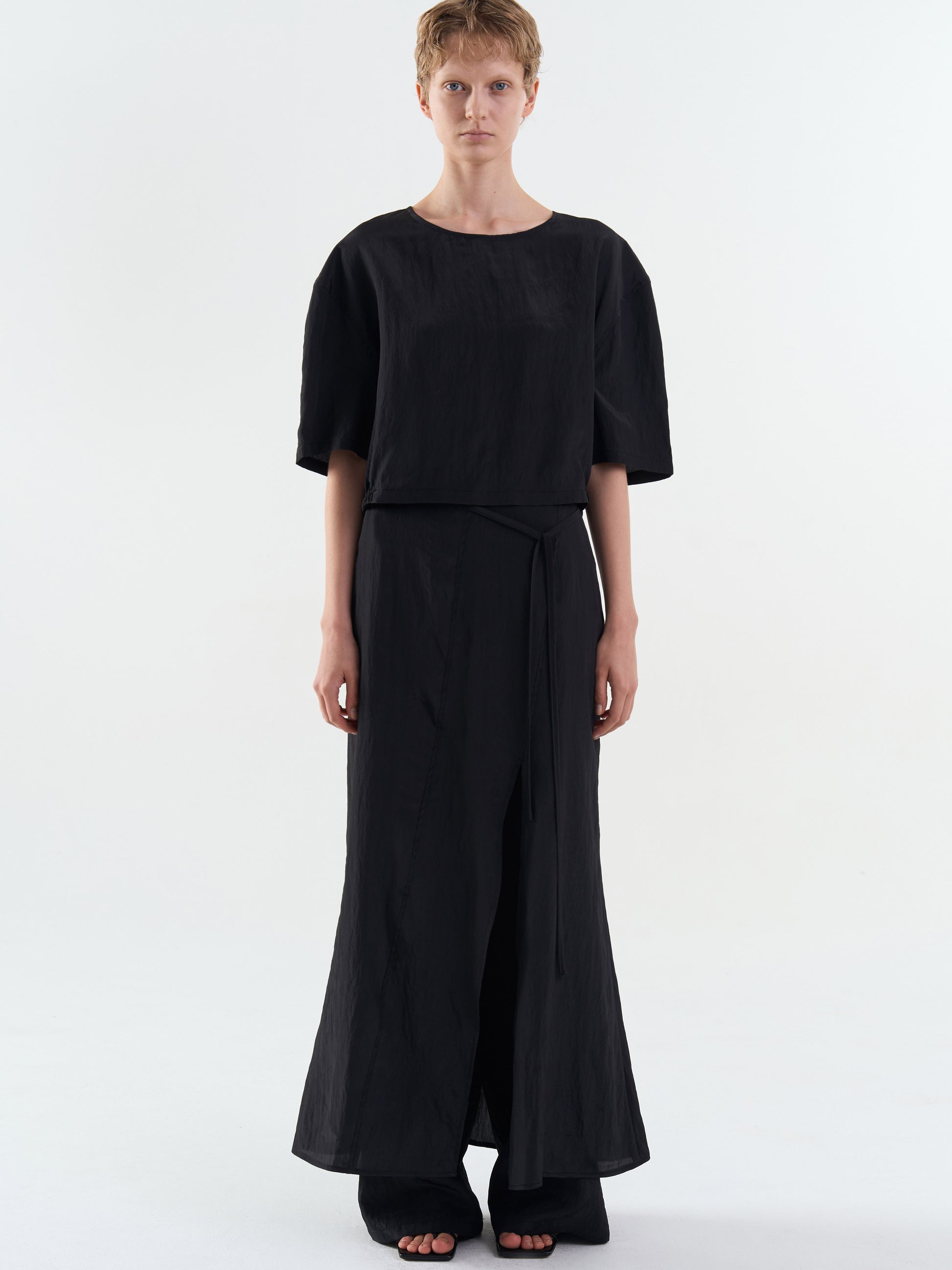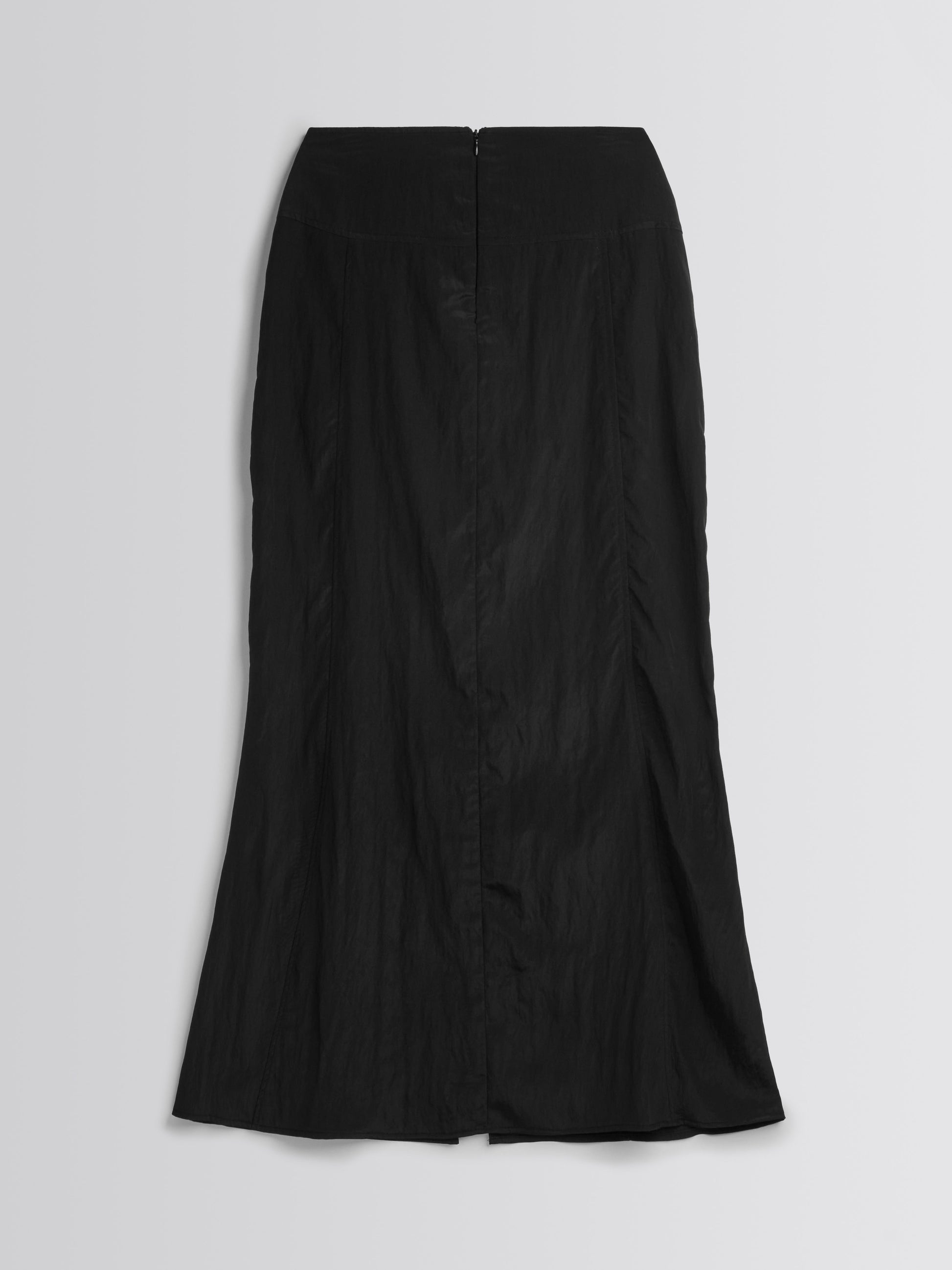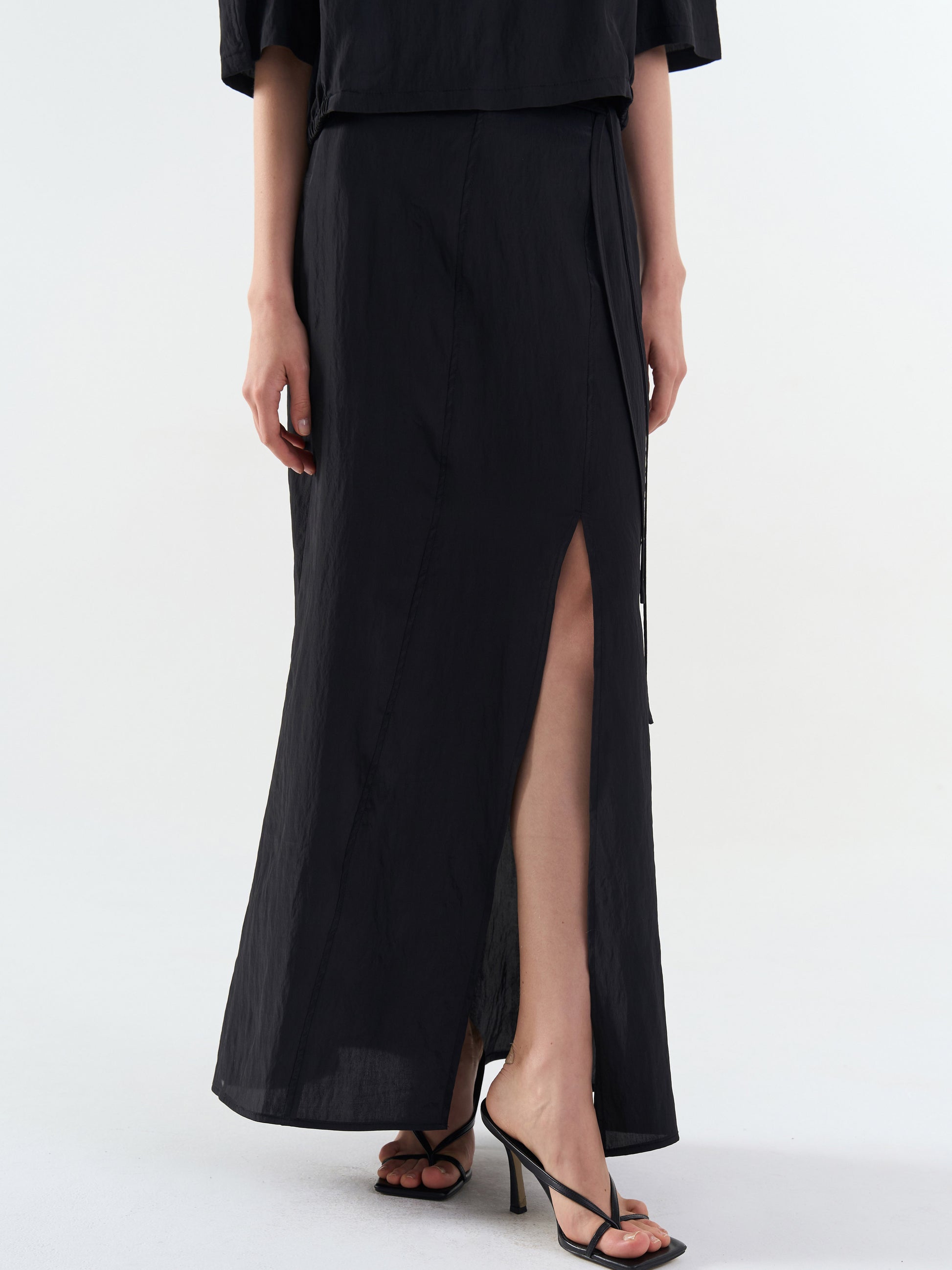 A breeze slit midi skirt with a delicate sheen and light texture.