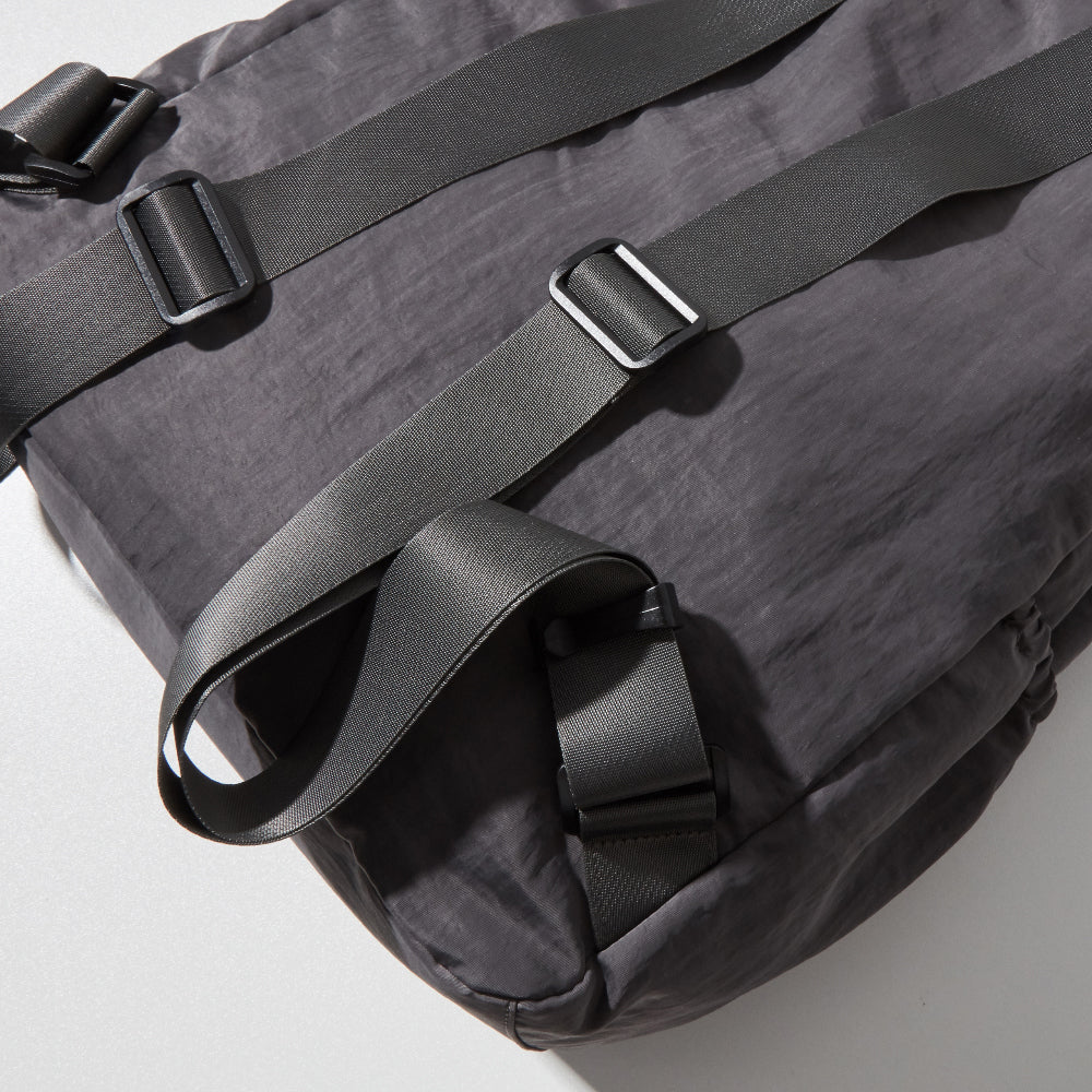 軽量なナイロン素材に、レザーのディテールを添え、日常のコーディネートに自然と溶け込みます。