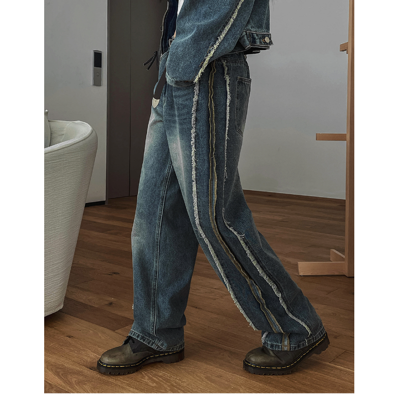 The Distressed Line Denim Set-up features a bold wash and distinctive cut-out lines that draw your eye. It is a set-up that exudes a street vibe, but also has a sophisticated feel to it.
