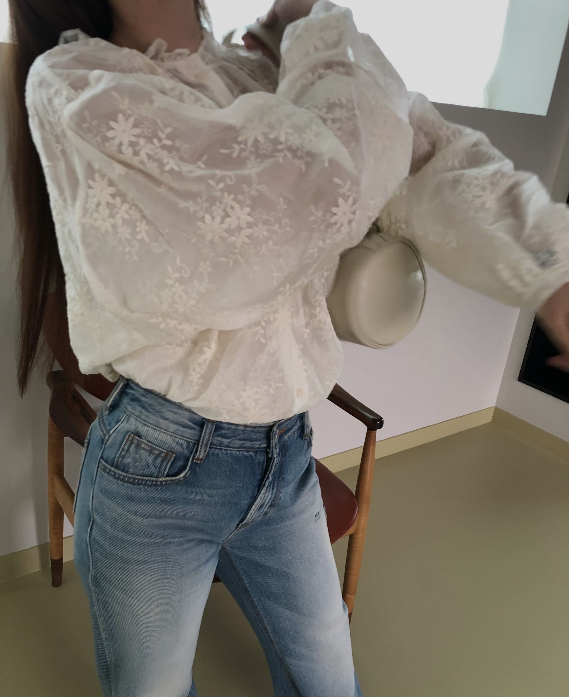 - さりげないレースパターンの生地と ネックラインのフリルディテールが加わり