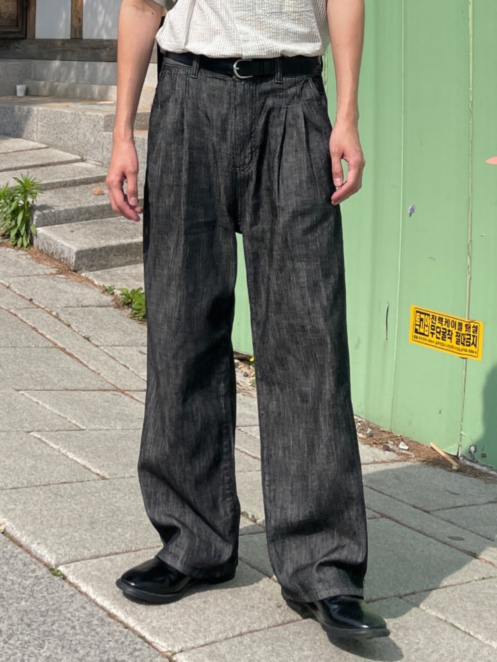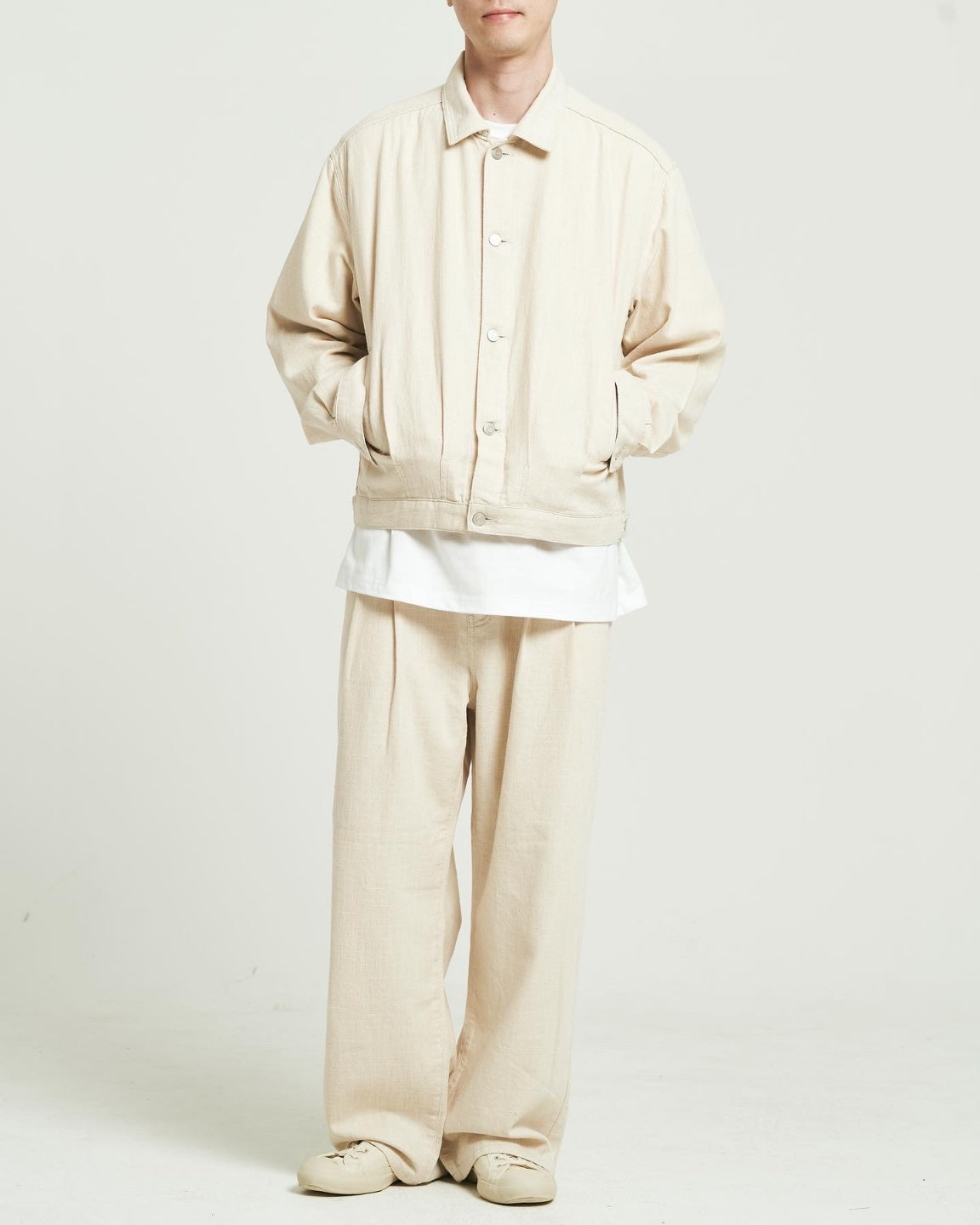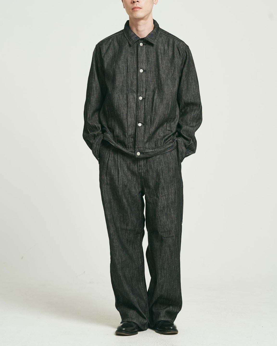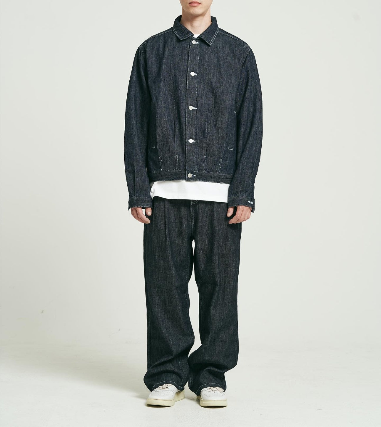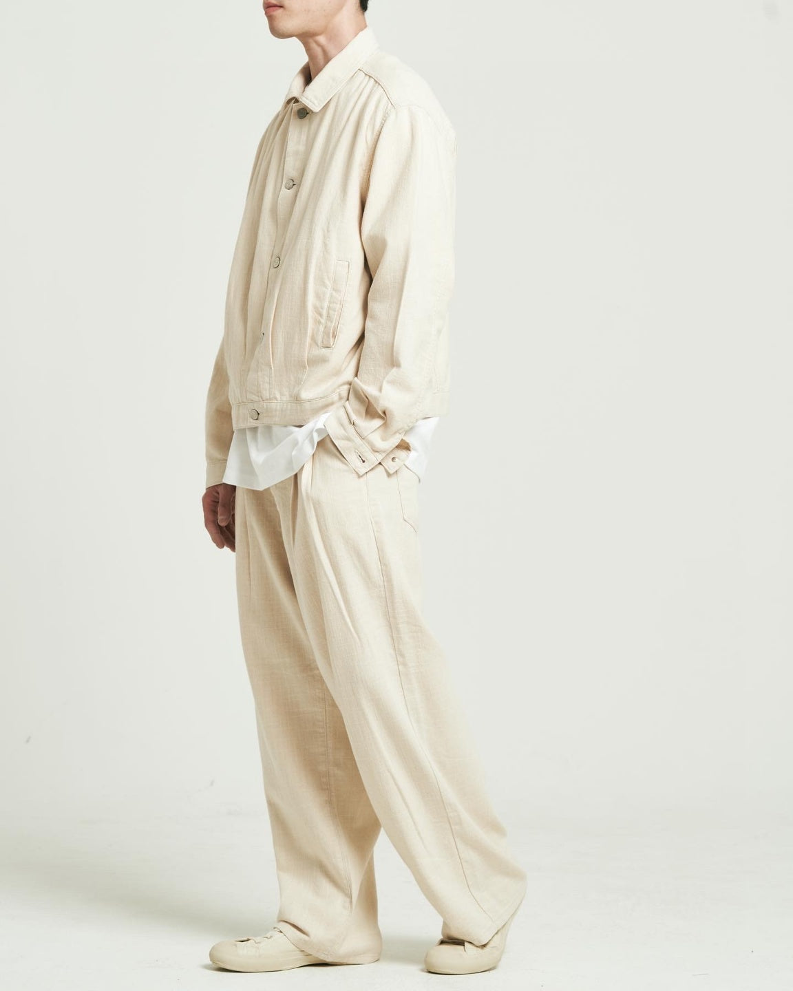 ジャケットはややショート丈でシャープな印象を与えつつ、ワイドストレートのパンツと合わせることでバランスの取れたAラインを演出。