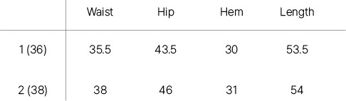 | Size | Waist | Hip | Hem | Length |