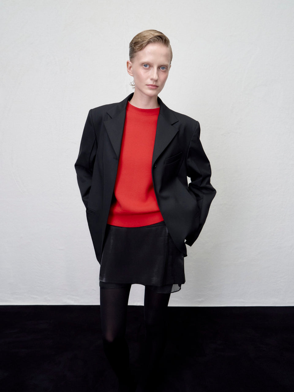 ワイドパンツや構築的なトップスと組み合わせ、シャープなシルエットを主役に。