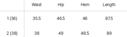 | Size | Waist | Hip | Hem | Length |
