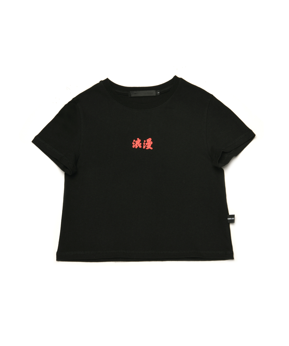 “浪漫(ロマン)”と描かれた漢字グラフィックを、クロップ丈に落とし込んだミニマルなTシャツ。