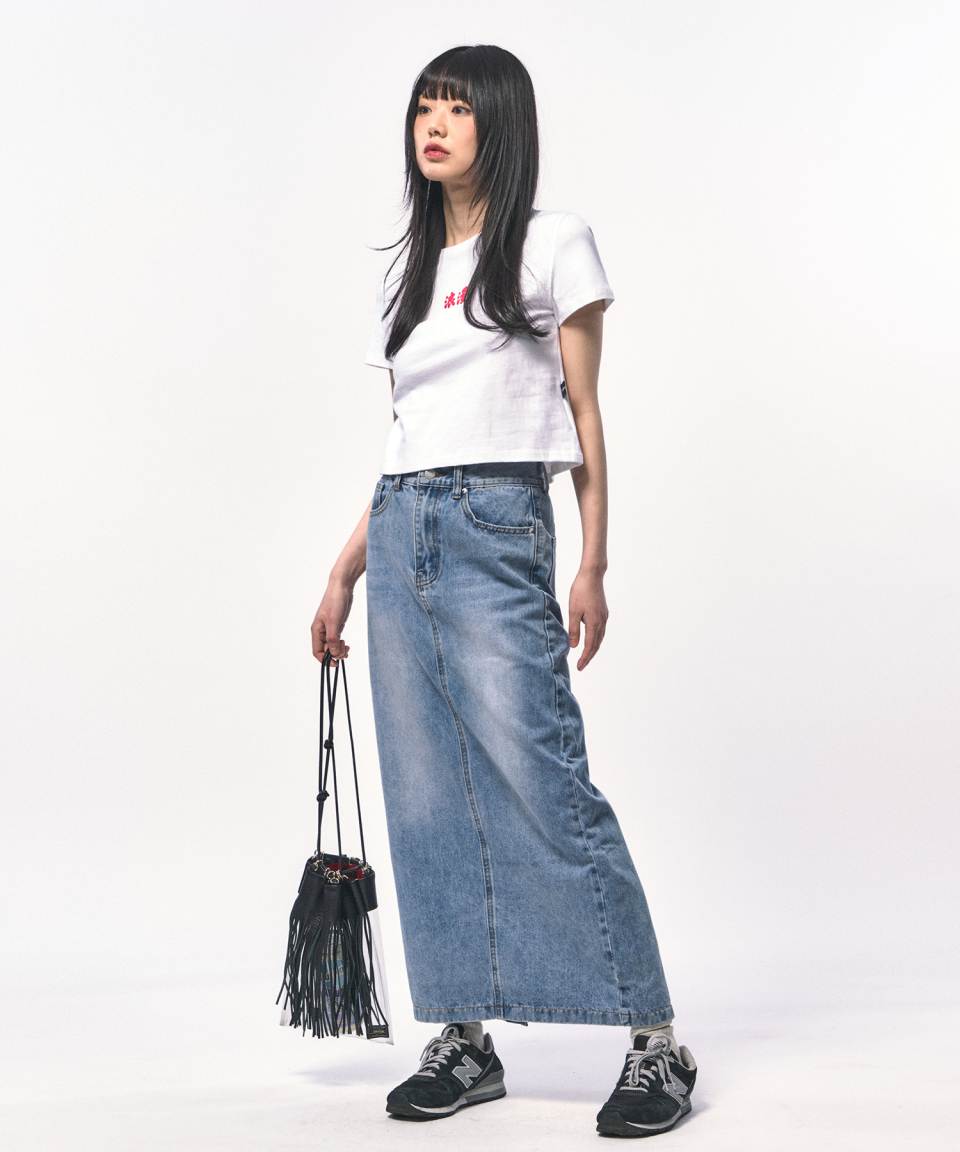羽織りの隙間からロゴを覗かせ、余白を感じる大人のコーデへ。