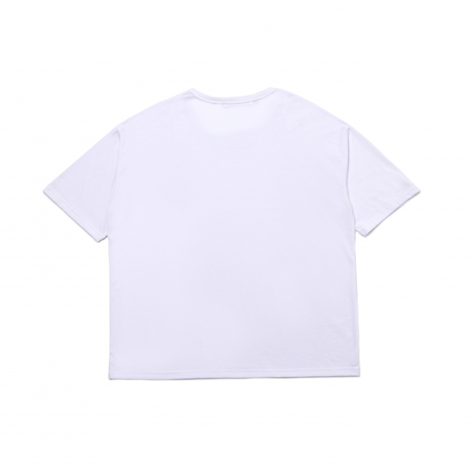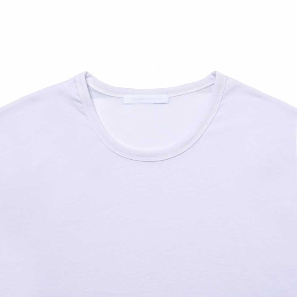 シルケット加工によるほのかな光沢が、ホワイトの清潔感をよりいっそう引き立てるスクープネックTシャツ。