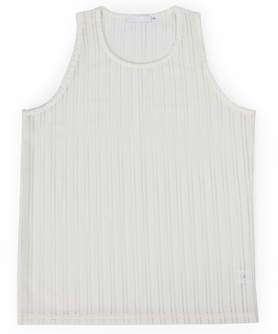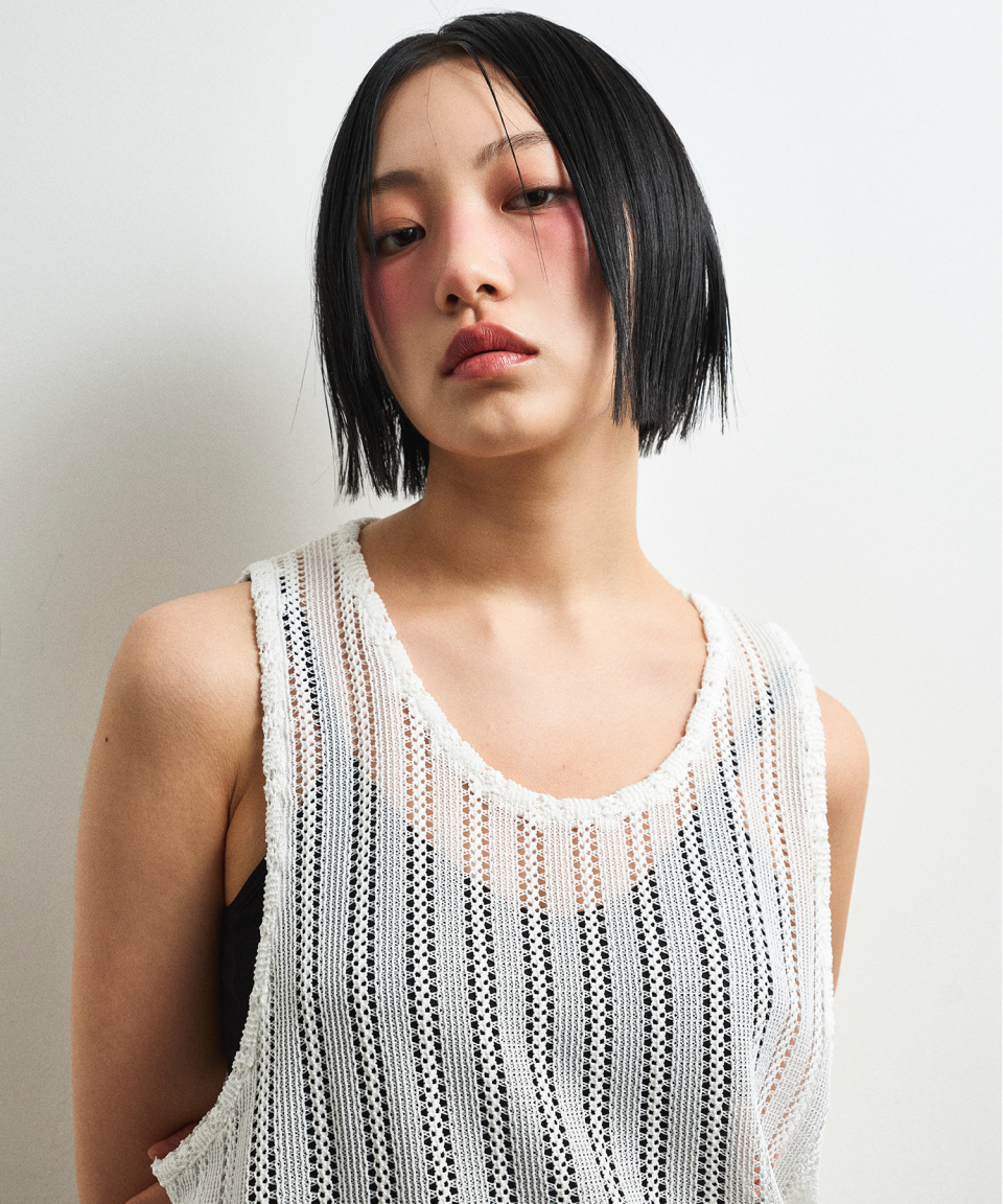 柔らかな光を透かすシースルー編みが、ホワイトカラーの清潔感と重なり、肌そのもののニュアンスを美しく映し出すスリーブレスニット。