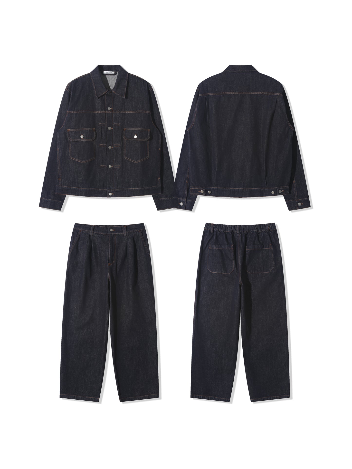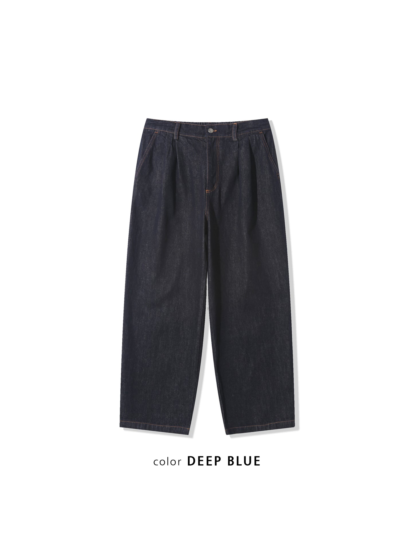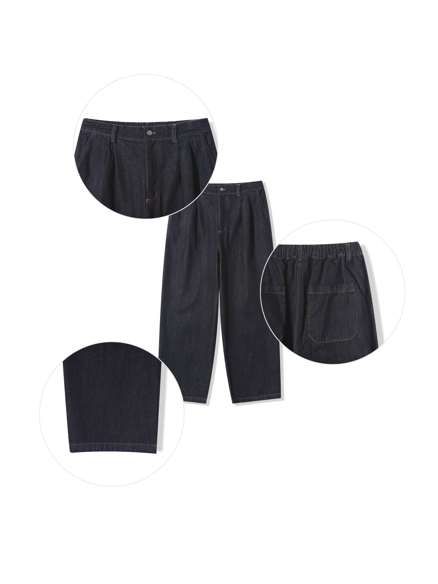 深みのあるインディゴカラーが魅力のダークデニムパンツ。しっかりとしたコットン生地を使用し、洗練されたワイドシルエットを実現しました。ウエスト後部にゴムを配して快適なフィット感を提供しつつ、フロントタックで上品な表情をプラス。Tシャツやシャツをタックインしてもバランス良く決まります。