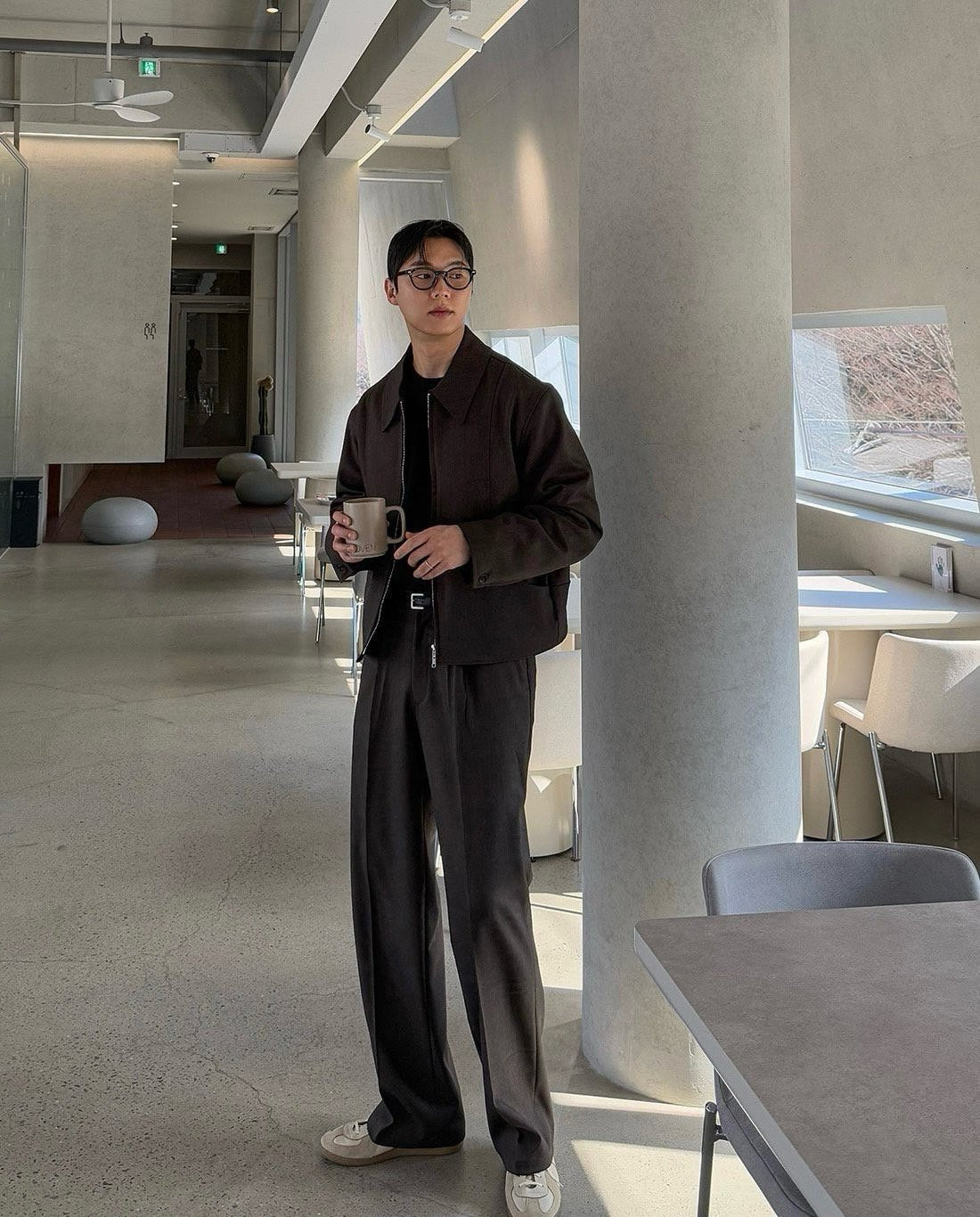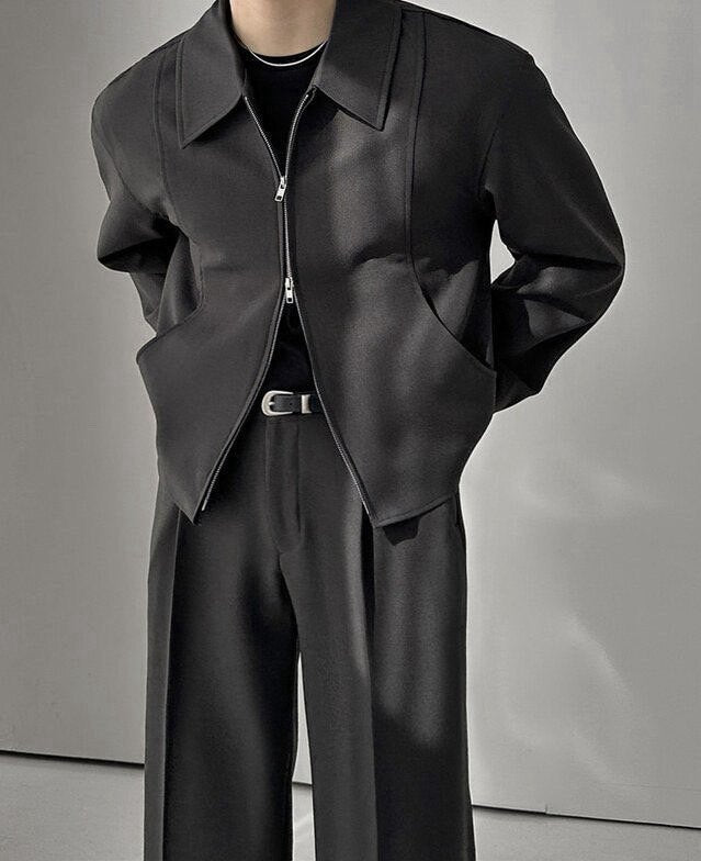 ミニマルなブルゾンとワンタックパンツを組み合わせたセットアップ。 無駄を削ぎ落としたデザインが、洗練された佇まいを生み出します。