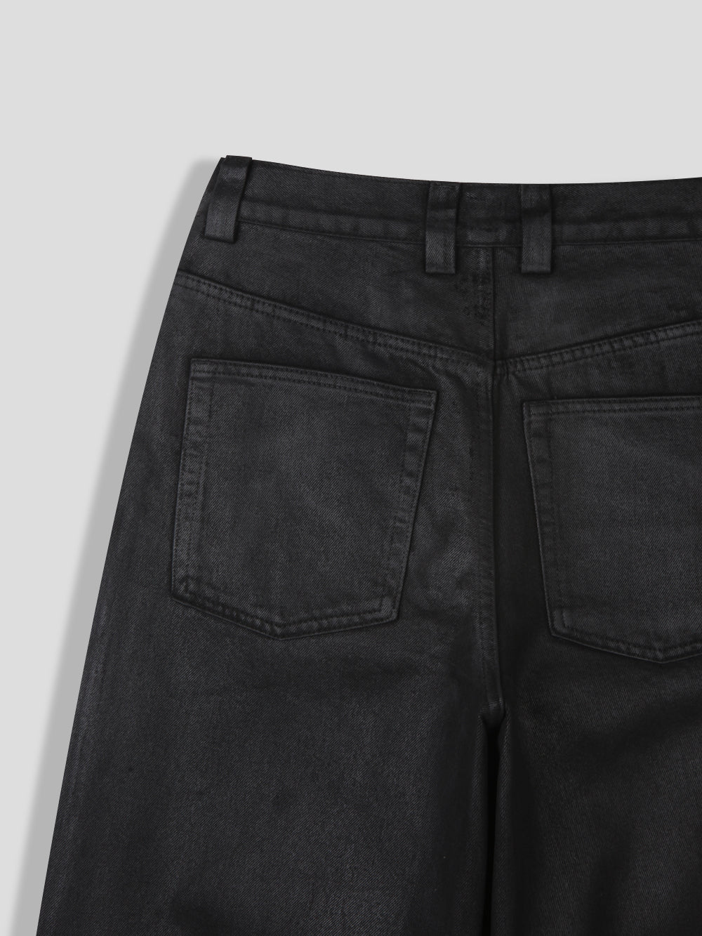 静かな光沢を纏った、ミッドナイトブラックのワックスドデニムパンツ。