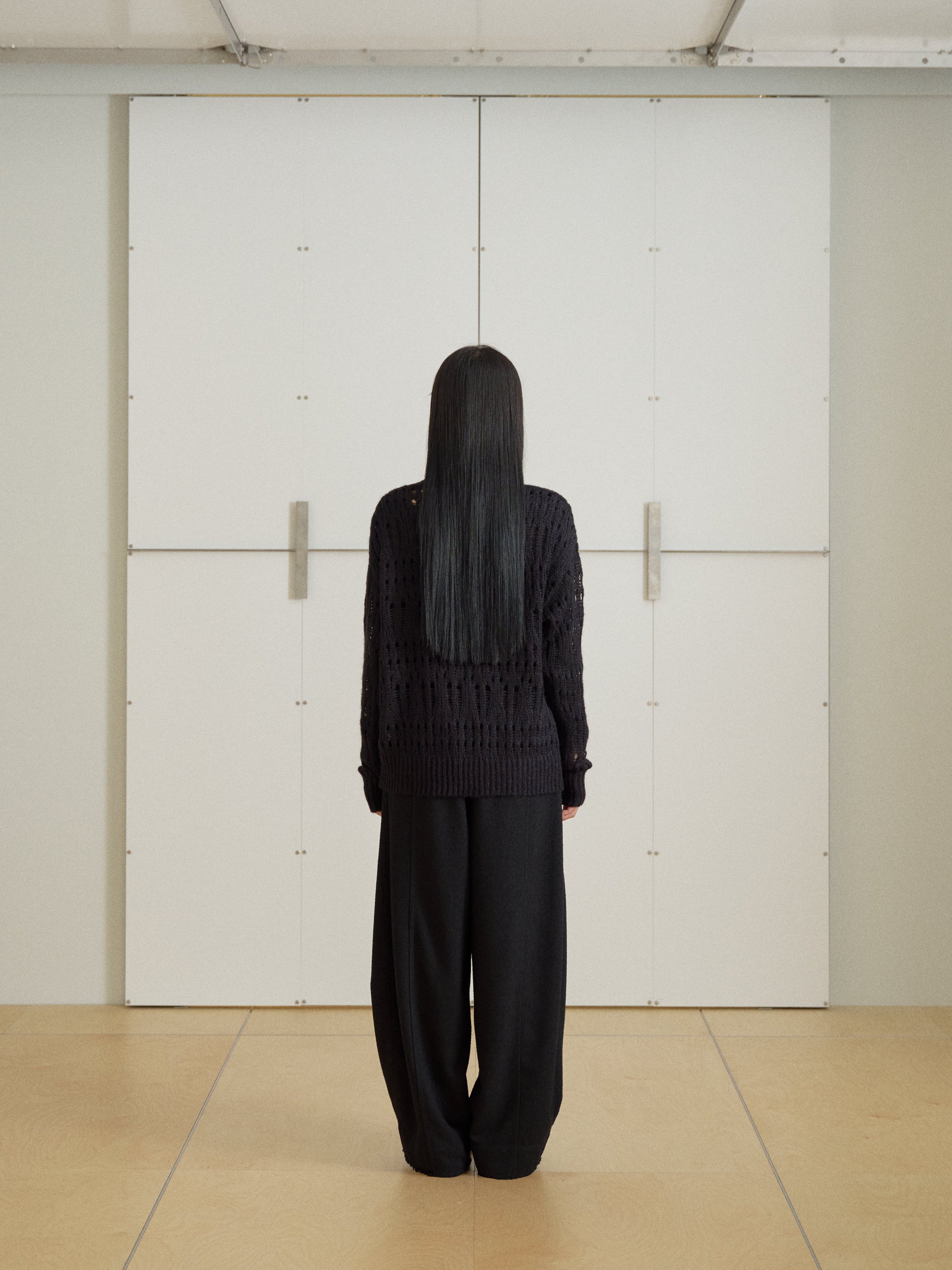 ほのかに肌が透けるオープンワークの表情がポイントで、軽やかな着心地とレイヤード映えを両立します。