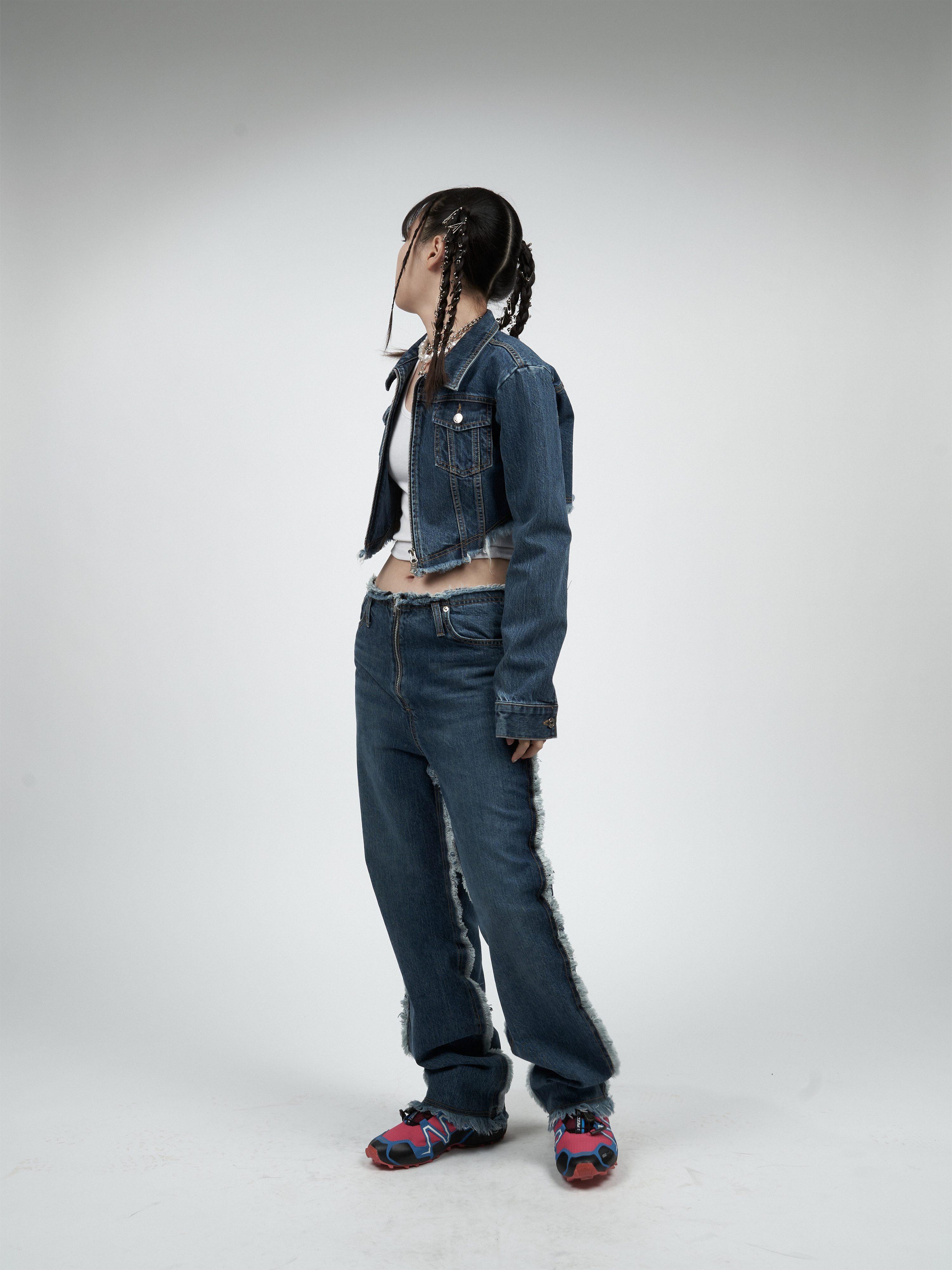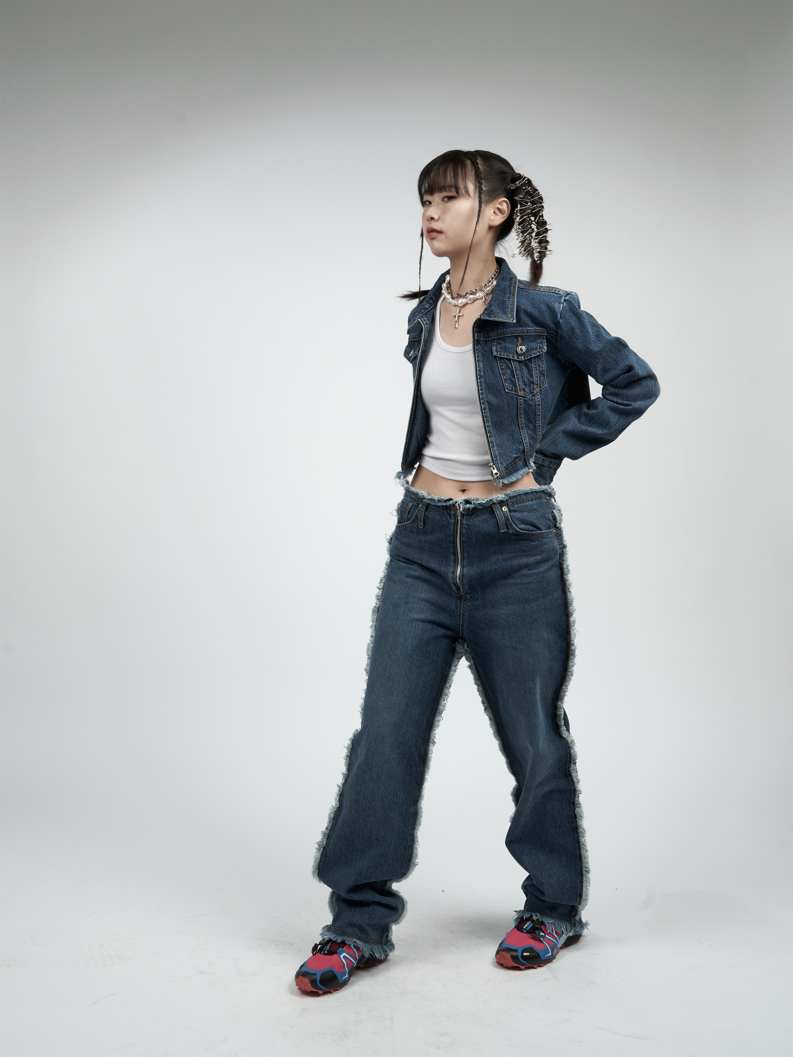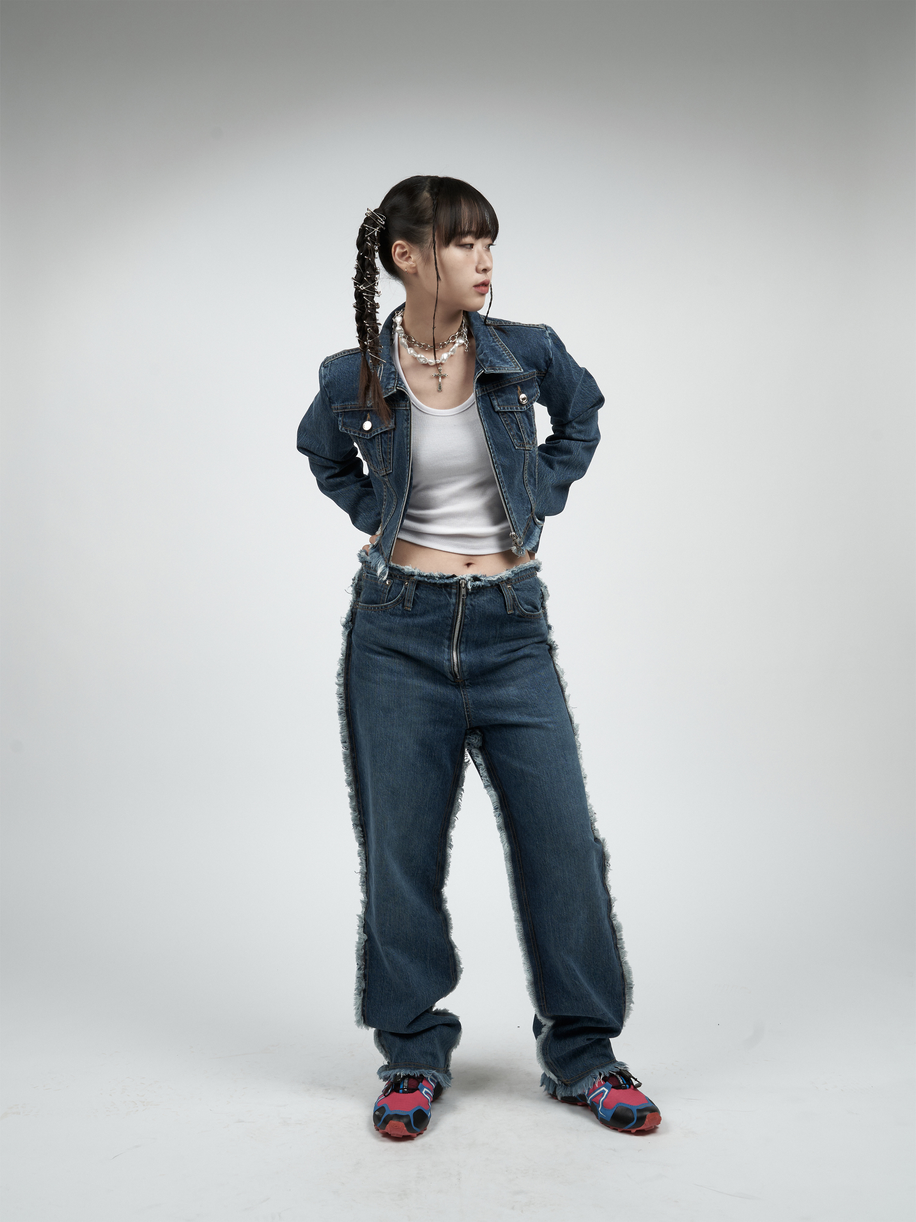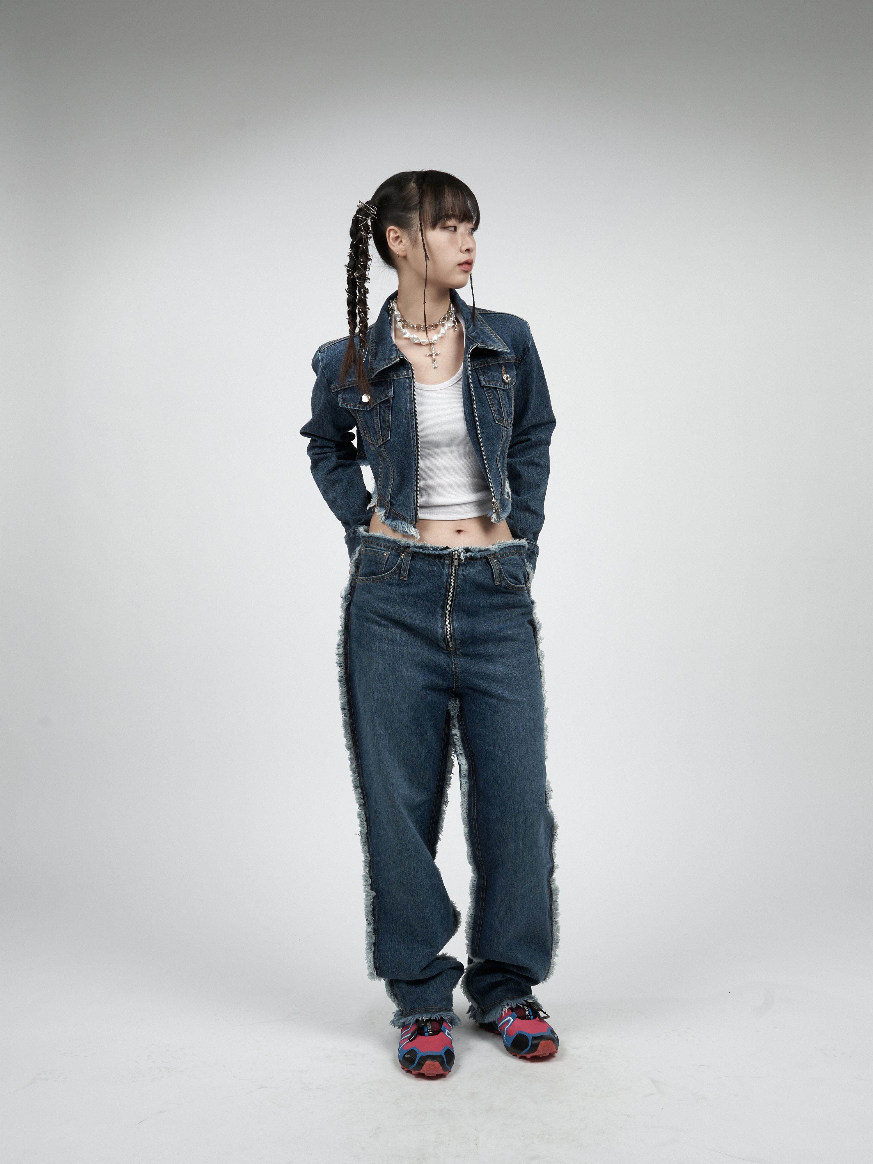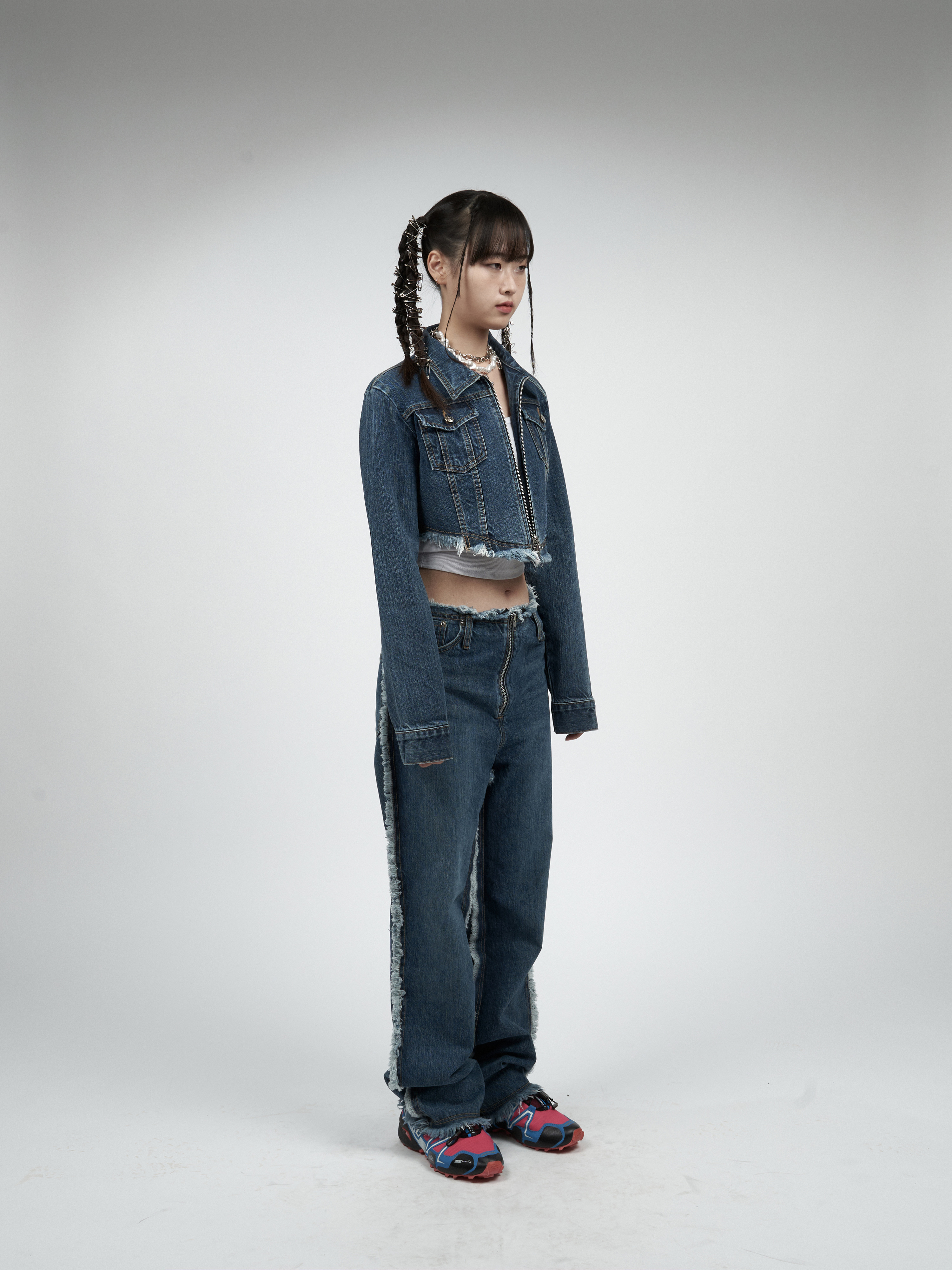 【MOMMANWA モンマンワ】DIAGONAL CROP DENIM JACKET (BLUE)
