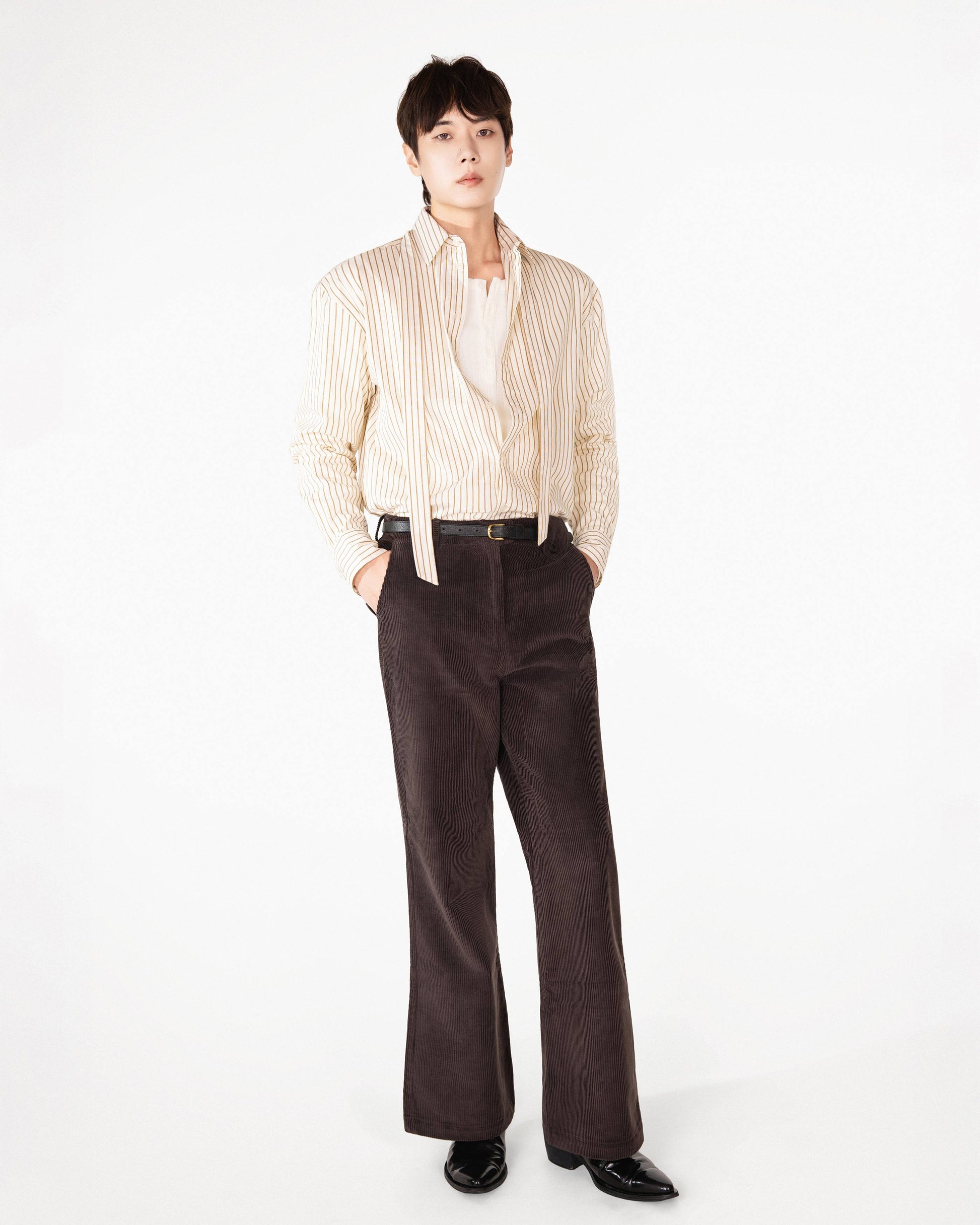 ブラックやベージュのスラックスと合わせ、落ち着いたトーンの韓国ファッションに。