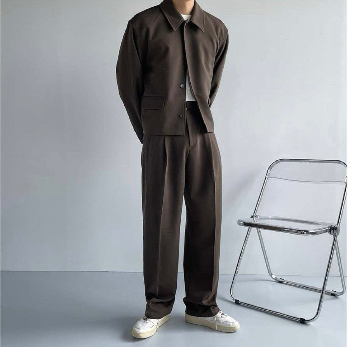 ジャケットは短丈でコンパクト、パンツはストレート寄りのワイドシルエット。