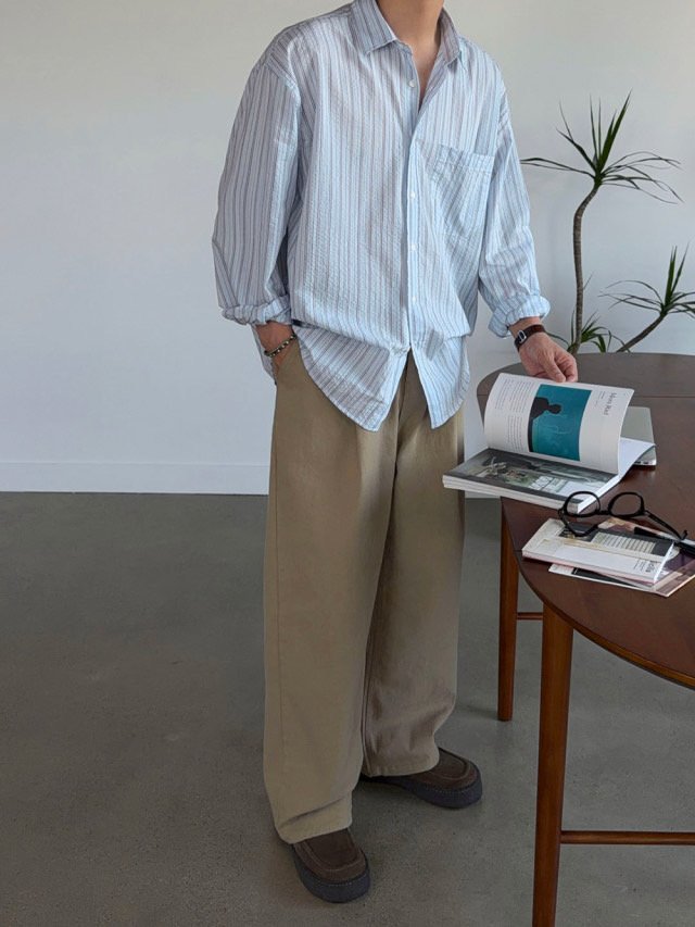 繊細なストライプが印象的な、オーバーサイズシャツ。 先染め生地ならではの奥行きのある表情と、ナチュラルな風合いが特徴です。