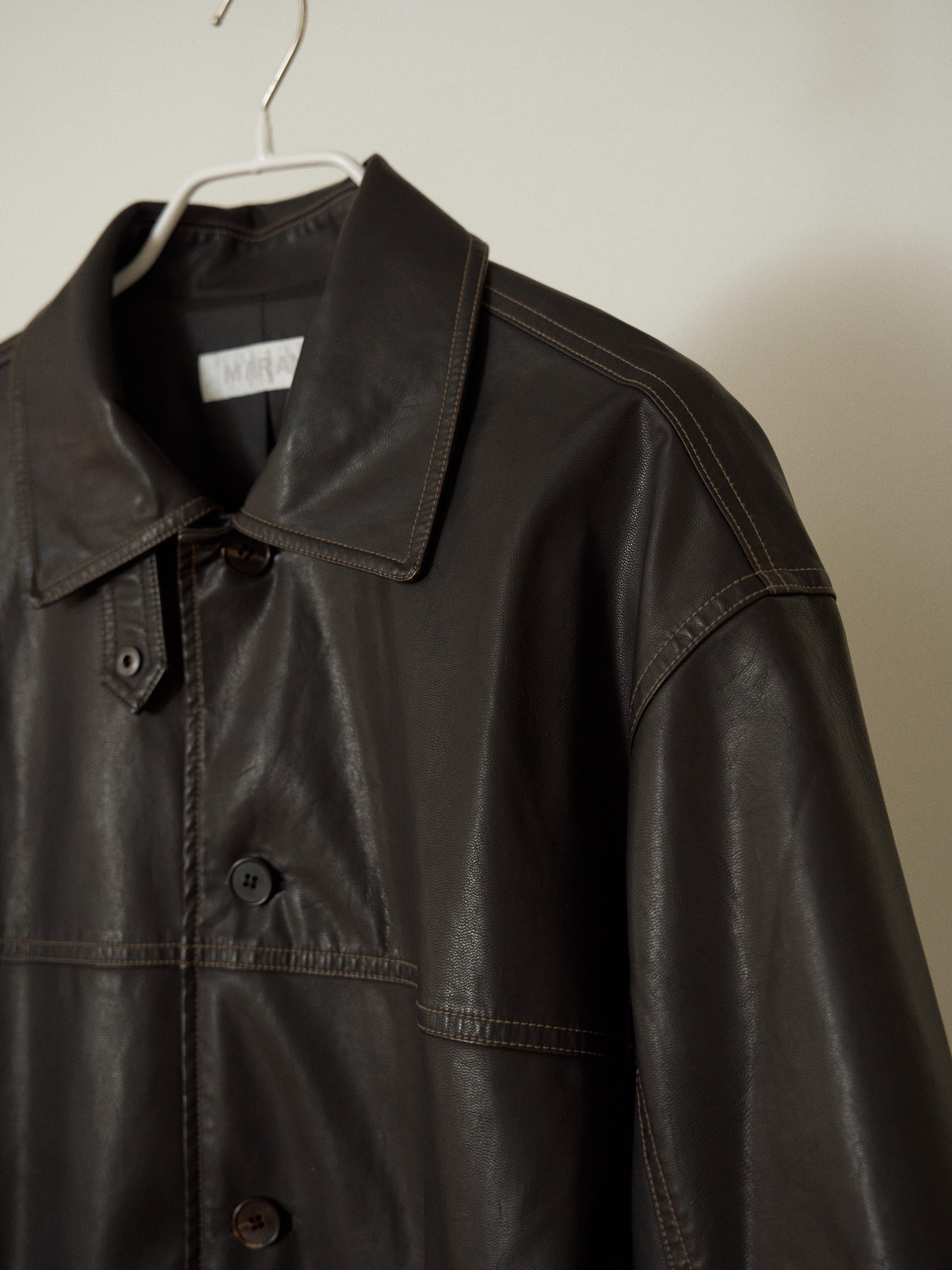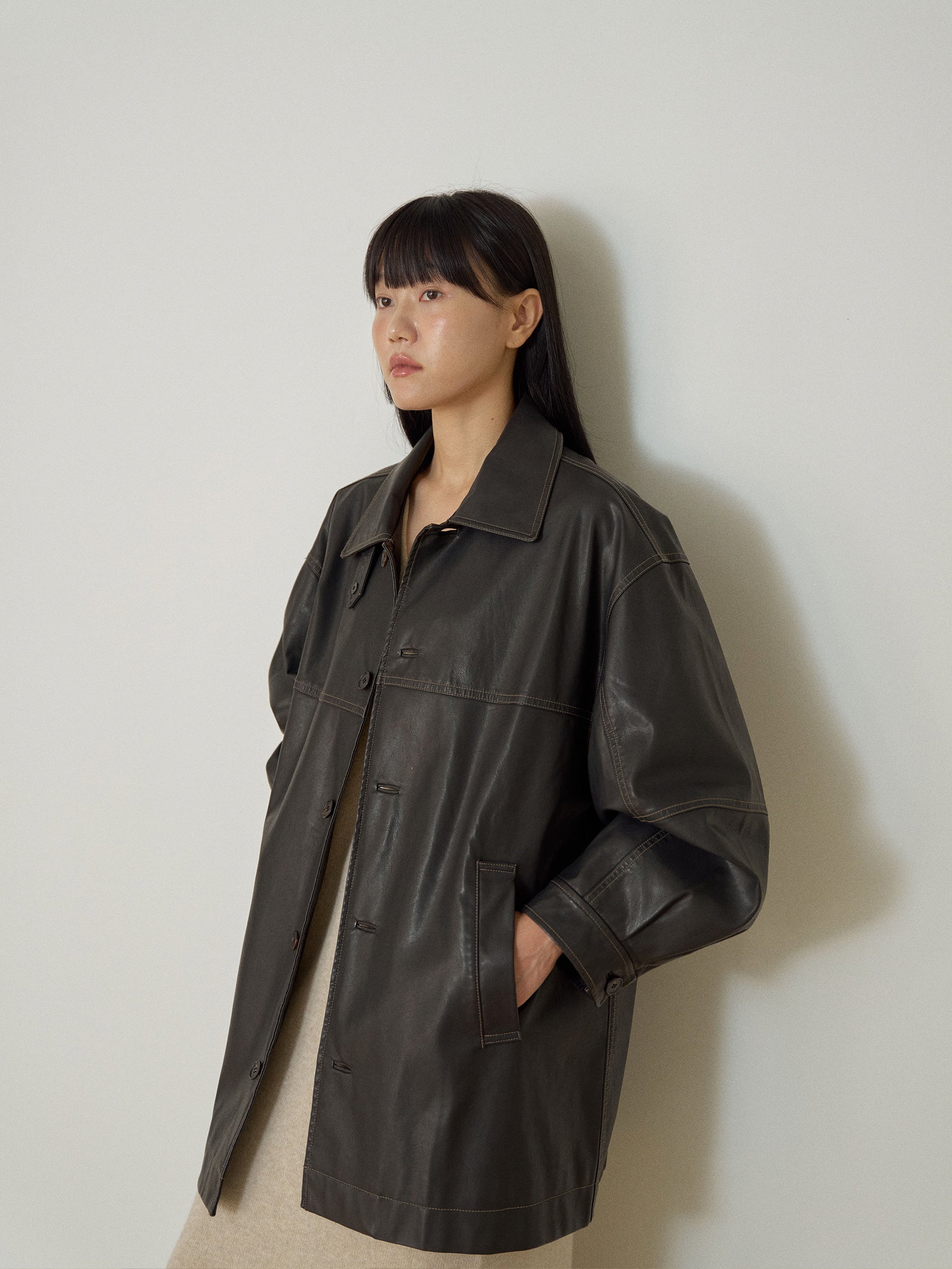 インドアでもアウトドアでも活躍する、オーバーサイズのフェイクレザー製ハーフコート。