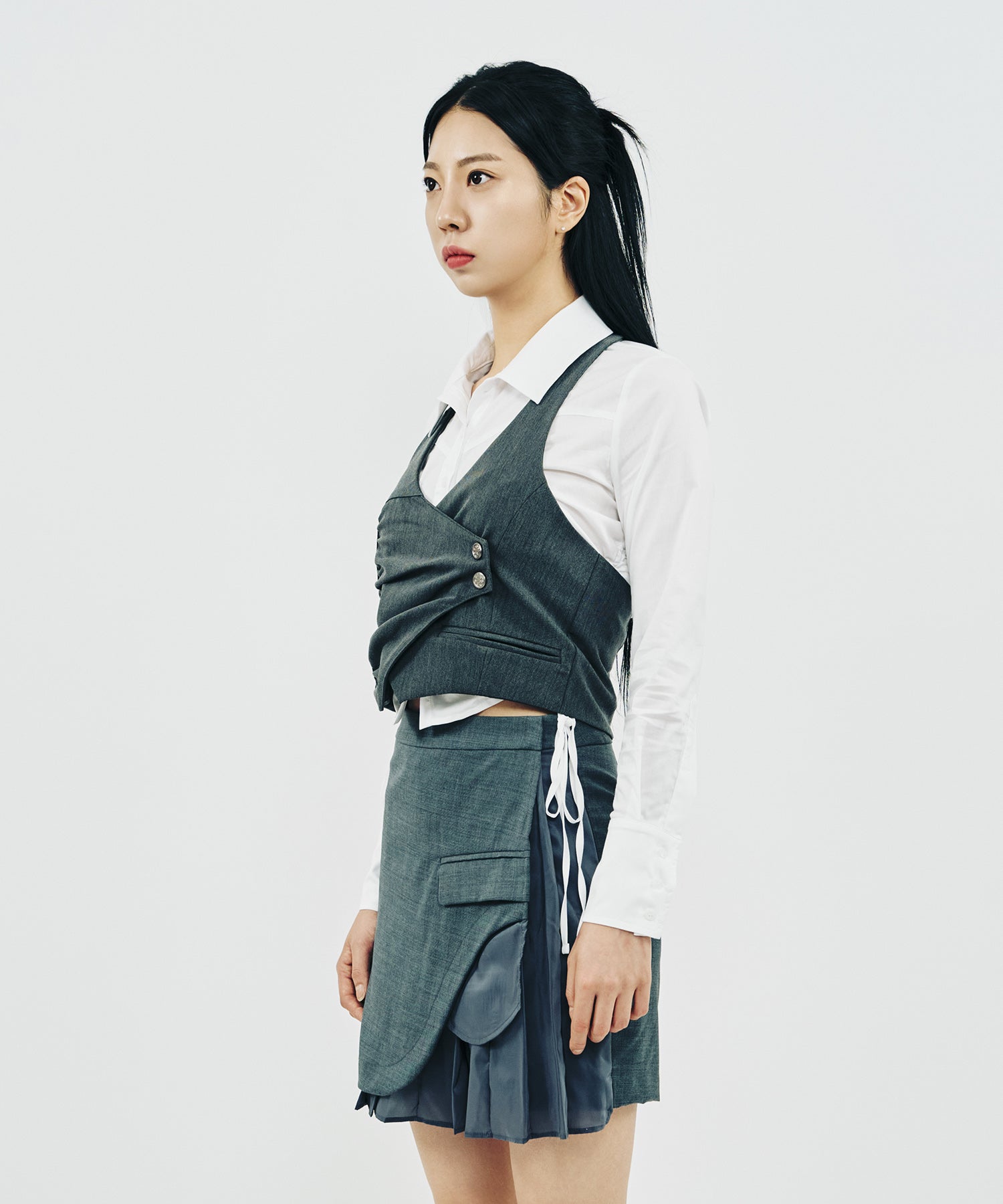 アシンメトリーなシャーリングディテールが印象的なベスト。背面にはサイズ調整が可能なアパーチャー付きで、フィット感を自在に調整可能。フロントのロゴシンボルスナップがアクセントを添えるデザイン。